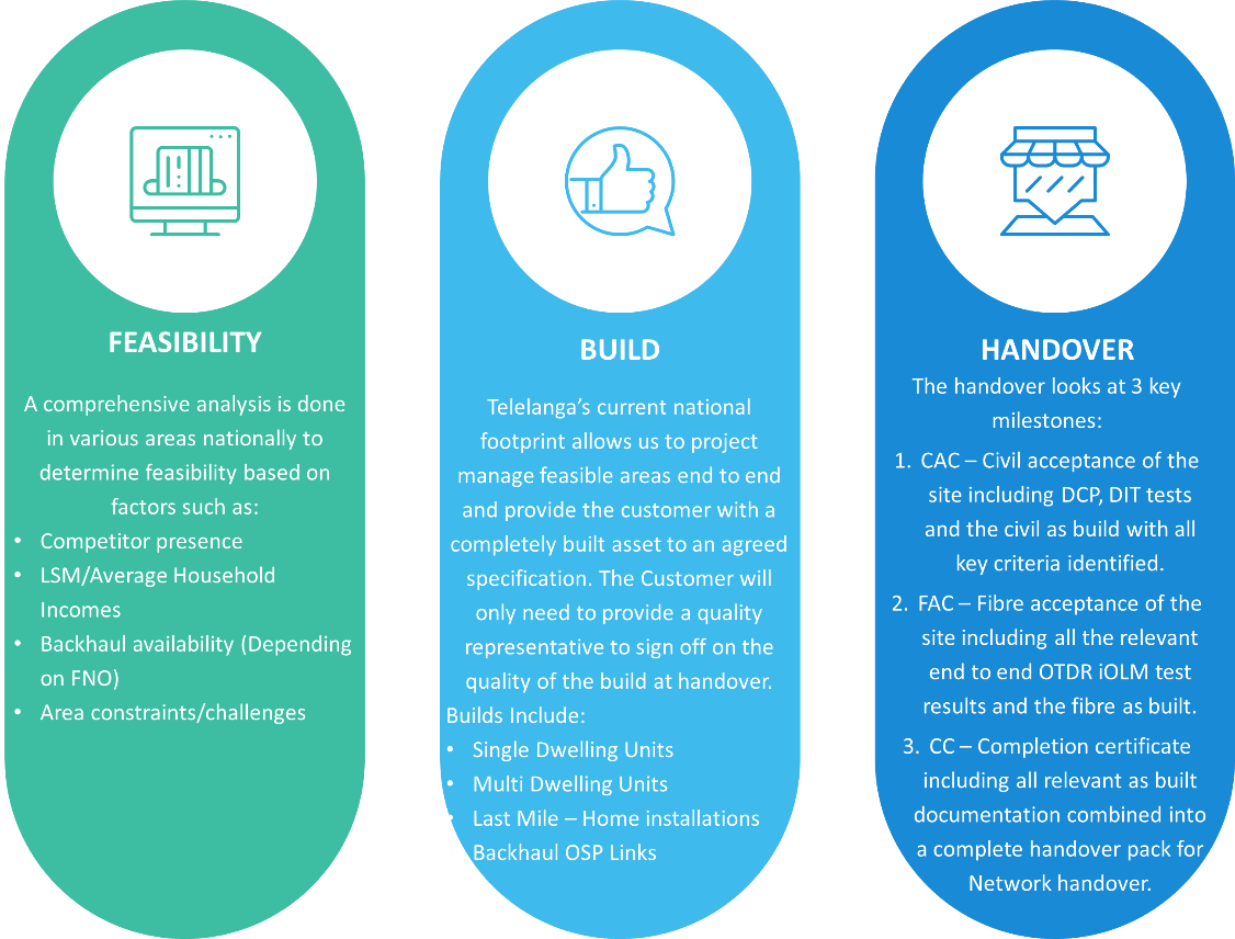 Telelanga is in a position to provide its customers with the level of contracting responsibility that is required by the customer. This could be in the role of the "Turnkey Contractor" facilitating the highest level of contracting responsibility. In this role Telelanga is held responsible for the overall project from assessment of user need to final completion, providing ultimate contracting comfort for the customer. This would include being responsible and accountable for the design of the entire required infrastructure as well as the implementation thereof.